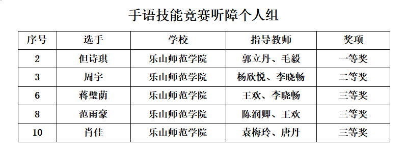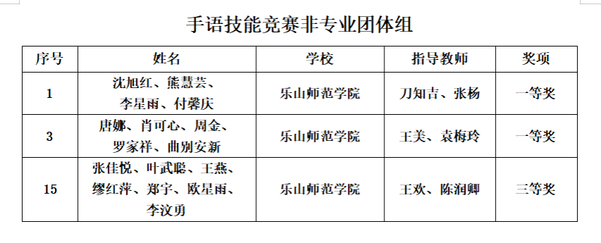 手语技能竞赛非专业团体组方面,沈旭红、熊慧芸、李星雨、付馨庆、唐娜、肖可心、周金、罗家祥、曲别安新同学荣获一等奖;张佳悦、叶武聪、王燕、缪红萍、郑宇、欧星雨、李汶勇获得三等奖。