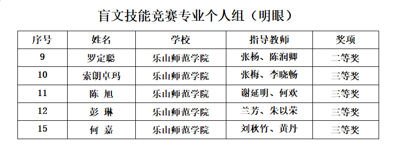 盲文技能竞赛专业个人组(明眼),罗定聪荣获一等奖,索朗卓玛、陈旭、彭琳、何嘉获得三等奖。