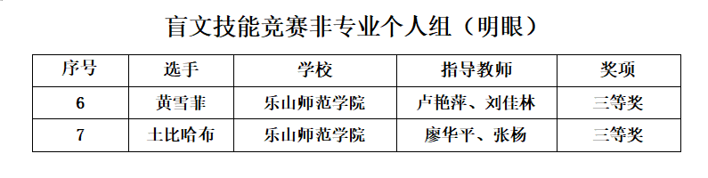 盲文技能竞赛非专业个人组(明眼),黄雪菲、土比哈布获得三等奖。