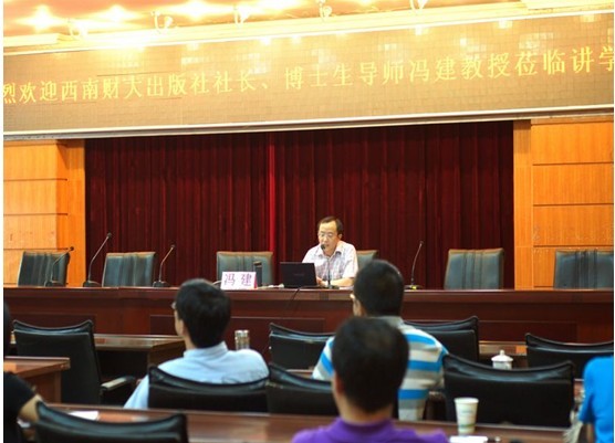 4月18日下午3点,西南财经大学出版社社长冯建教授应邀在弘毅楼第三会议室为我校教师作了题为“关于高校教材建设的几点体会”的专题讲座。讲座由教务处处长李朝晖教授主持,各教学院分管教学领导、教材建设项目负责人等到会聆听。